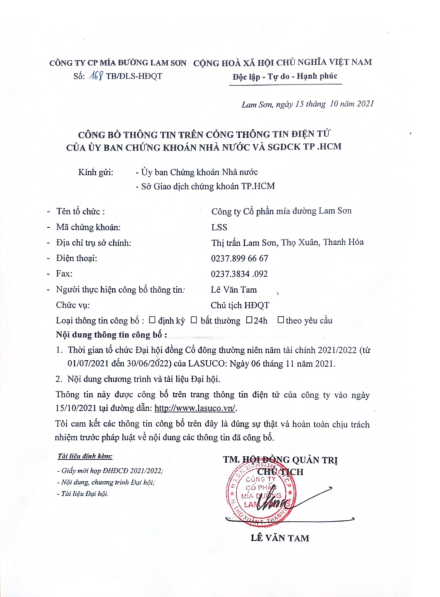 Đại hội đồng cổ đông TÀI LIỆU ĐẠI HỘI ĐỒNG CỔ ĐÔNG NĂM 2021/2022 – CÔNG TY CỔ PHẦN MÍA ĐƯỜNG LAM SƠN 15/10/2021
